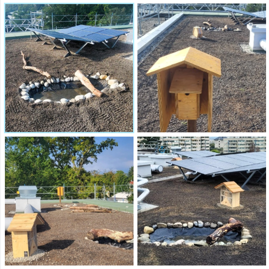 Végétalisation toiture extensive avec éléments en faveur de la biodiversité